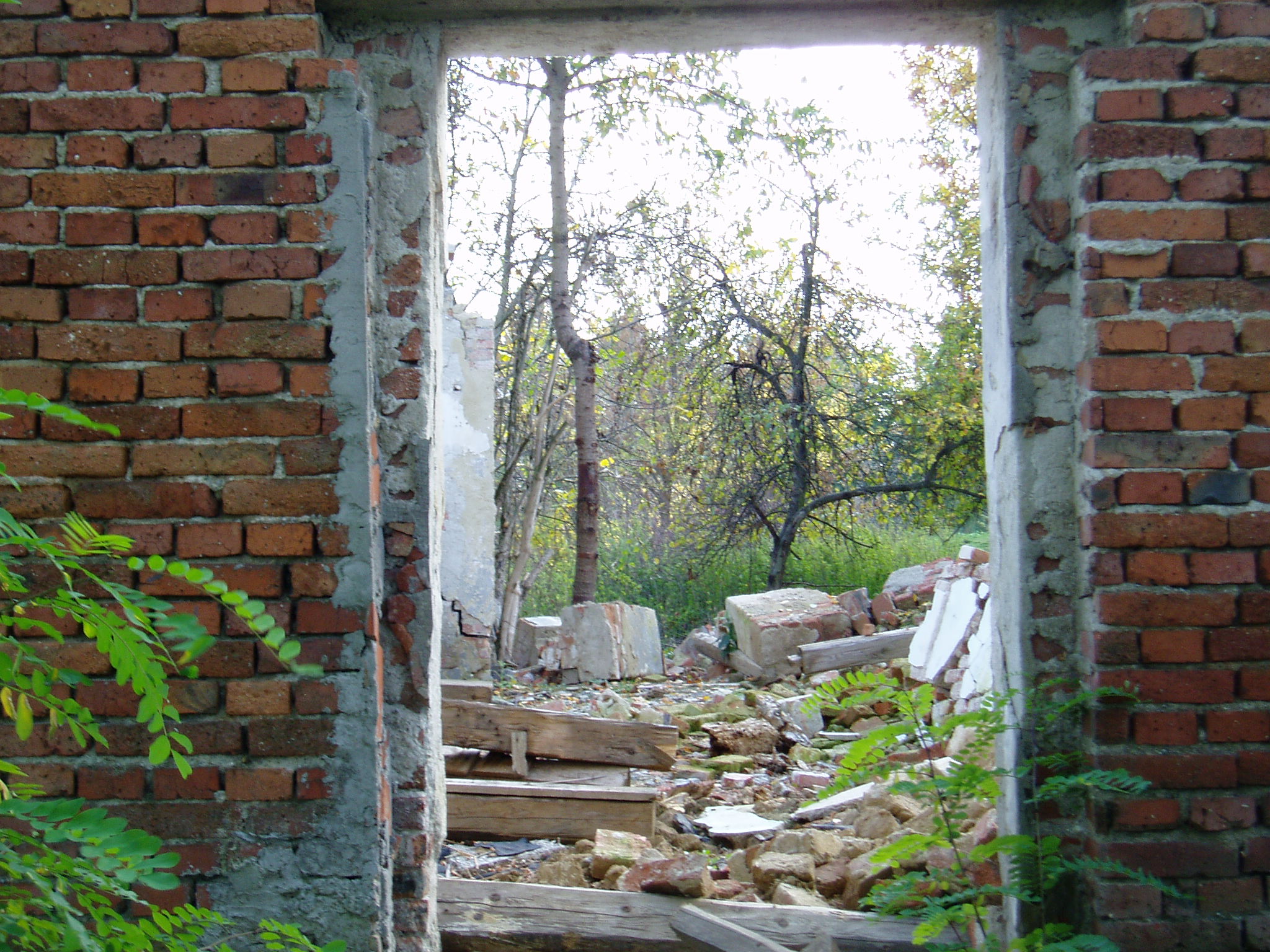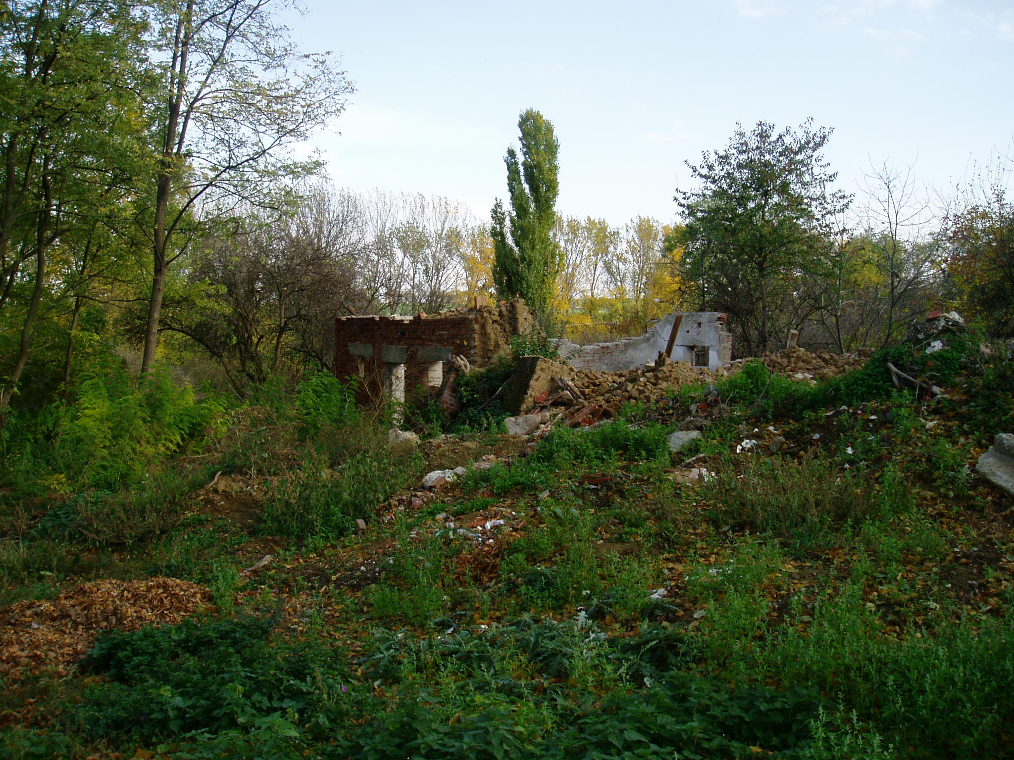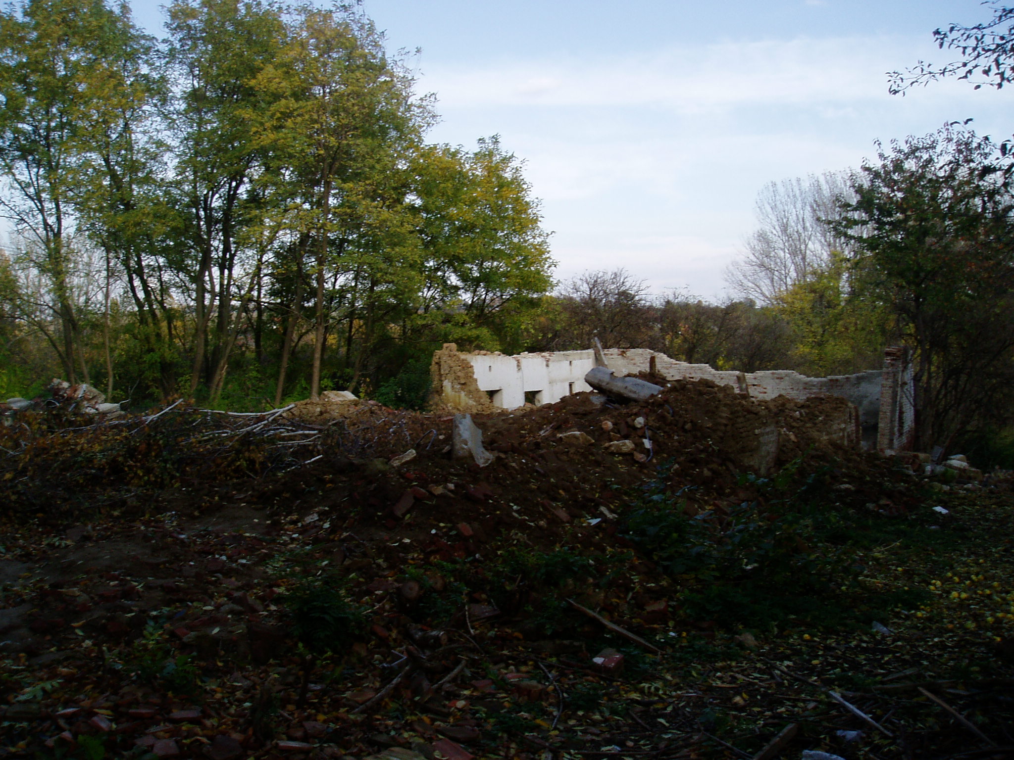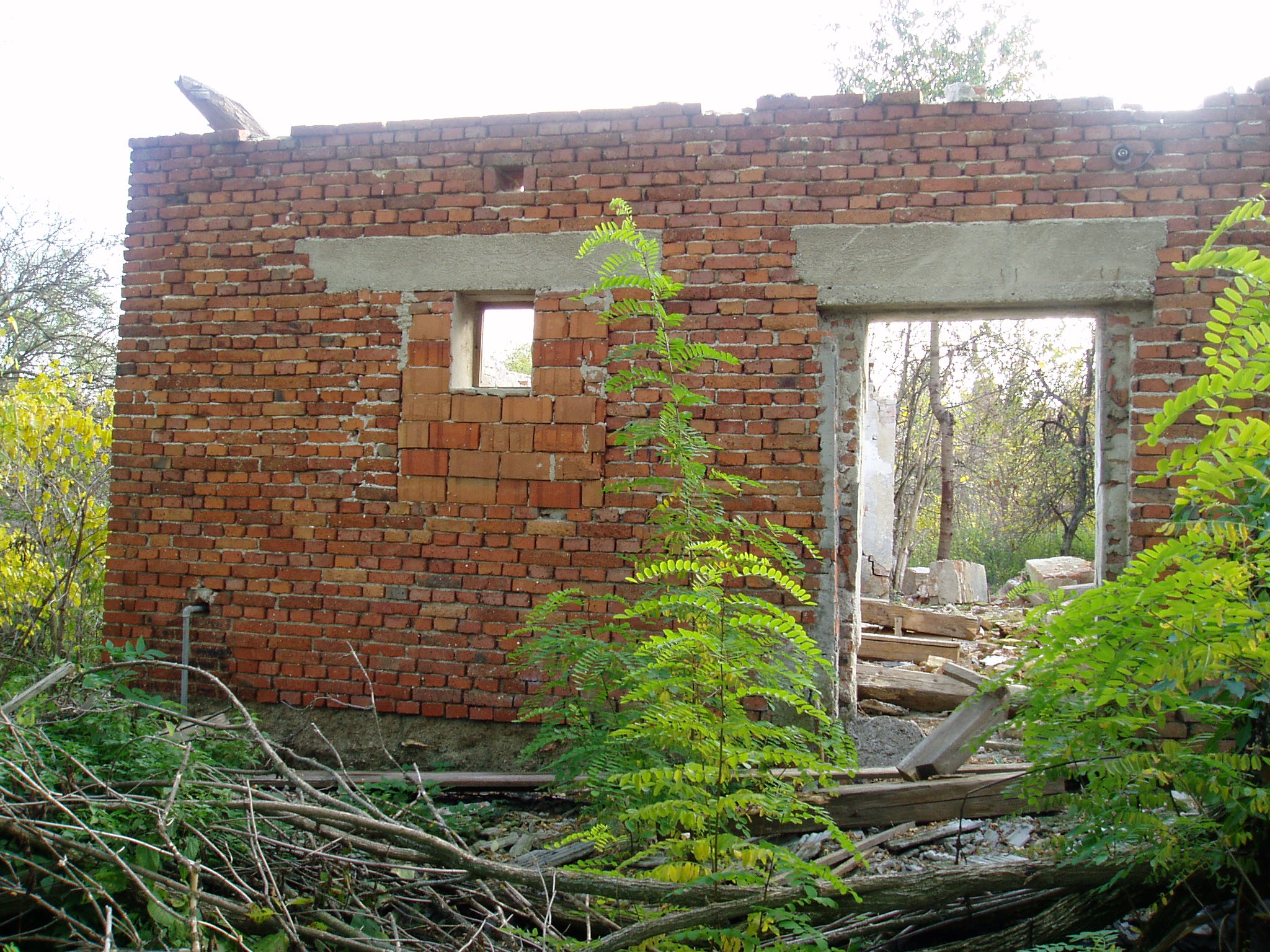 Popis: Pohľad na zvyšky budovy skladu agrochemikálií.