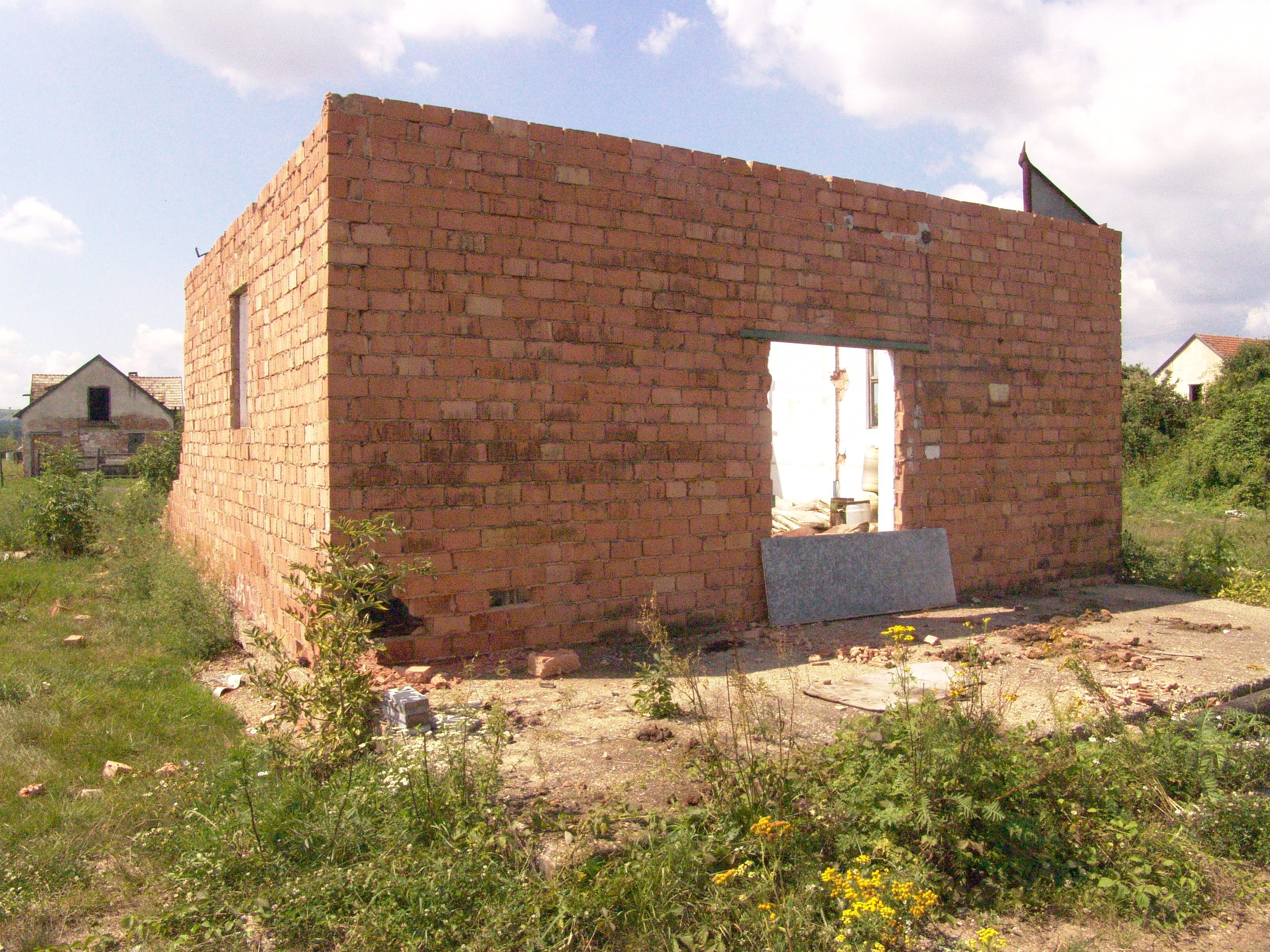 Popis: Pohľad na budovu skladu agrochemikálií bez strechy, okien a dverí.