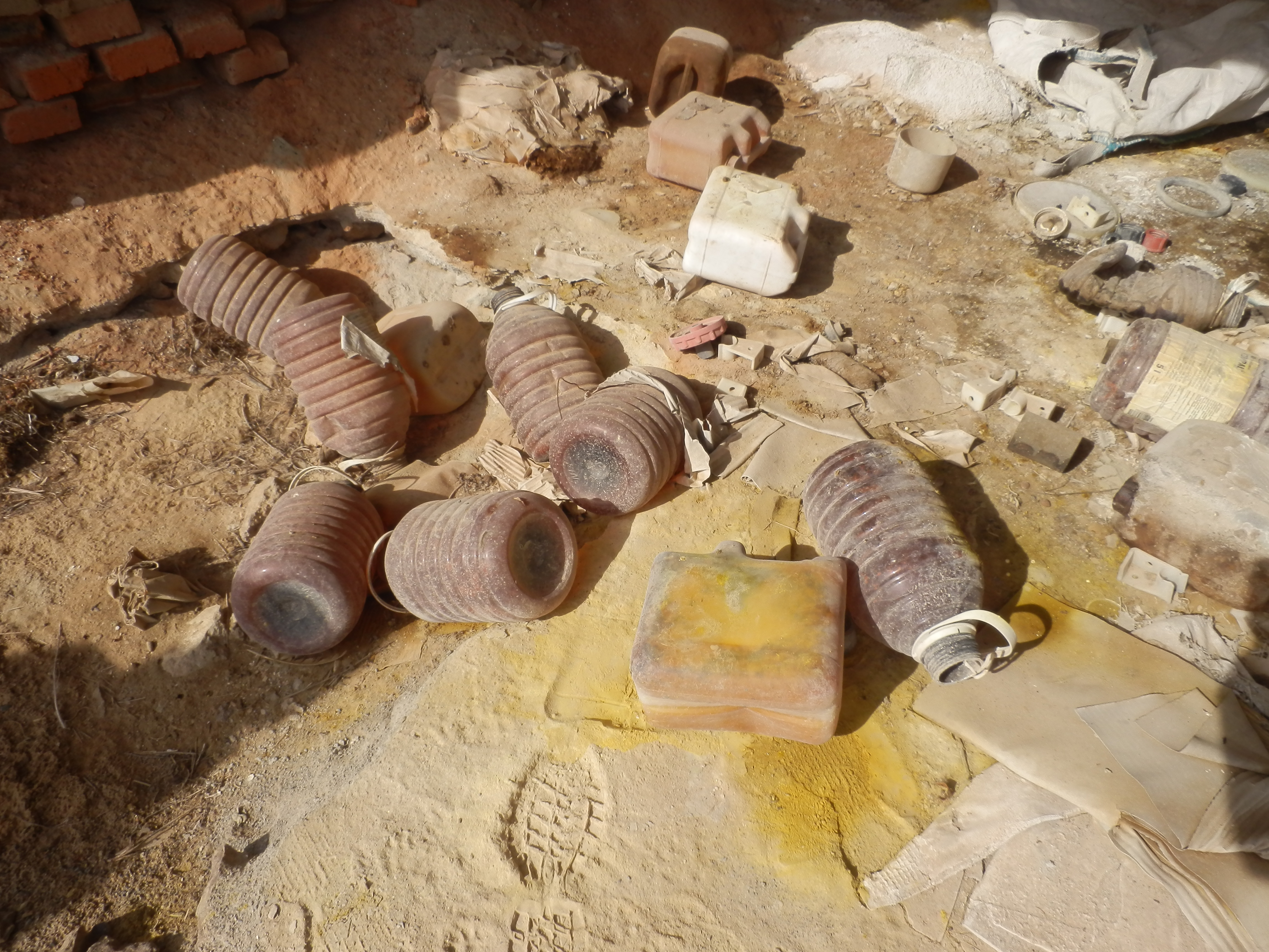 Na podlahe druhého skladu sa nachádzali prázdne plastové vrecia, poškodené papierové vrecia so zvyškami chemikálií, prázdne plastové bandasky.