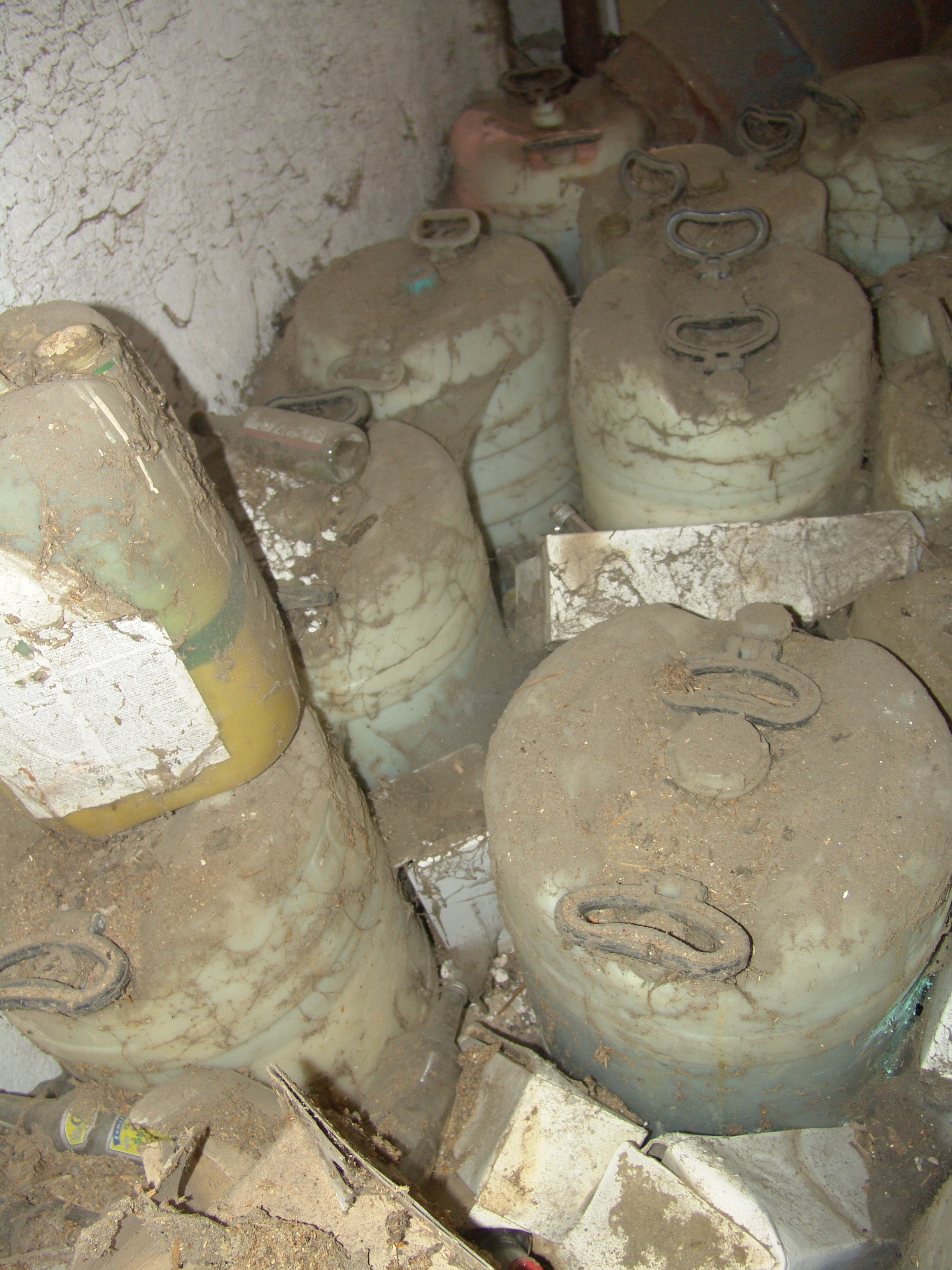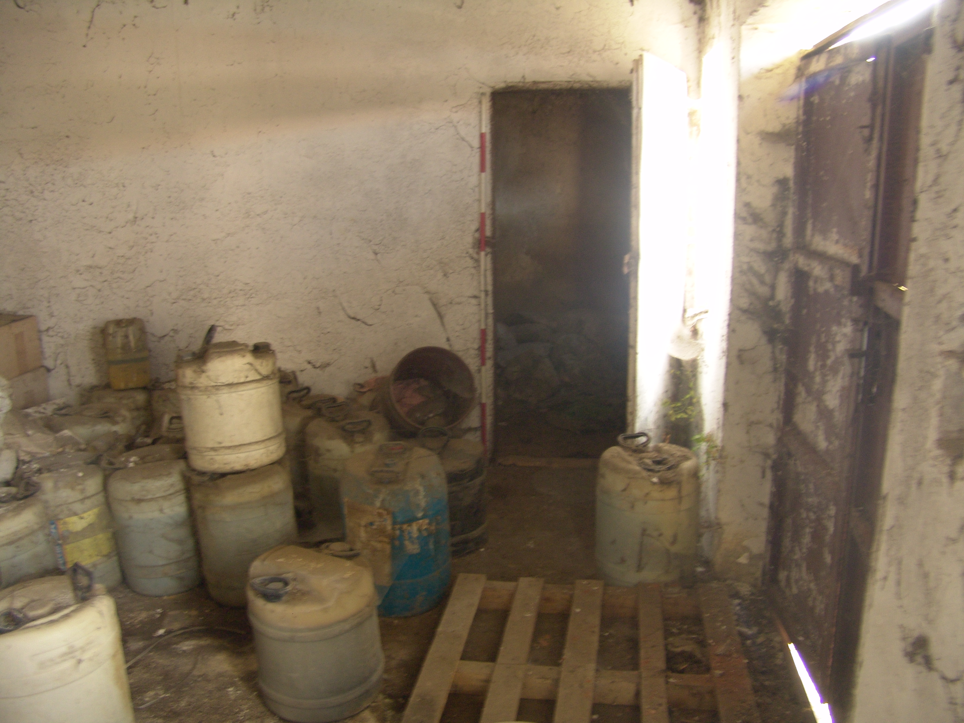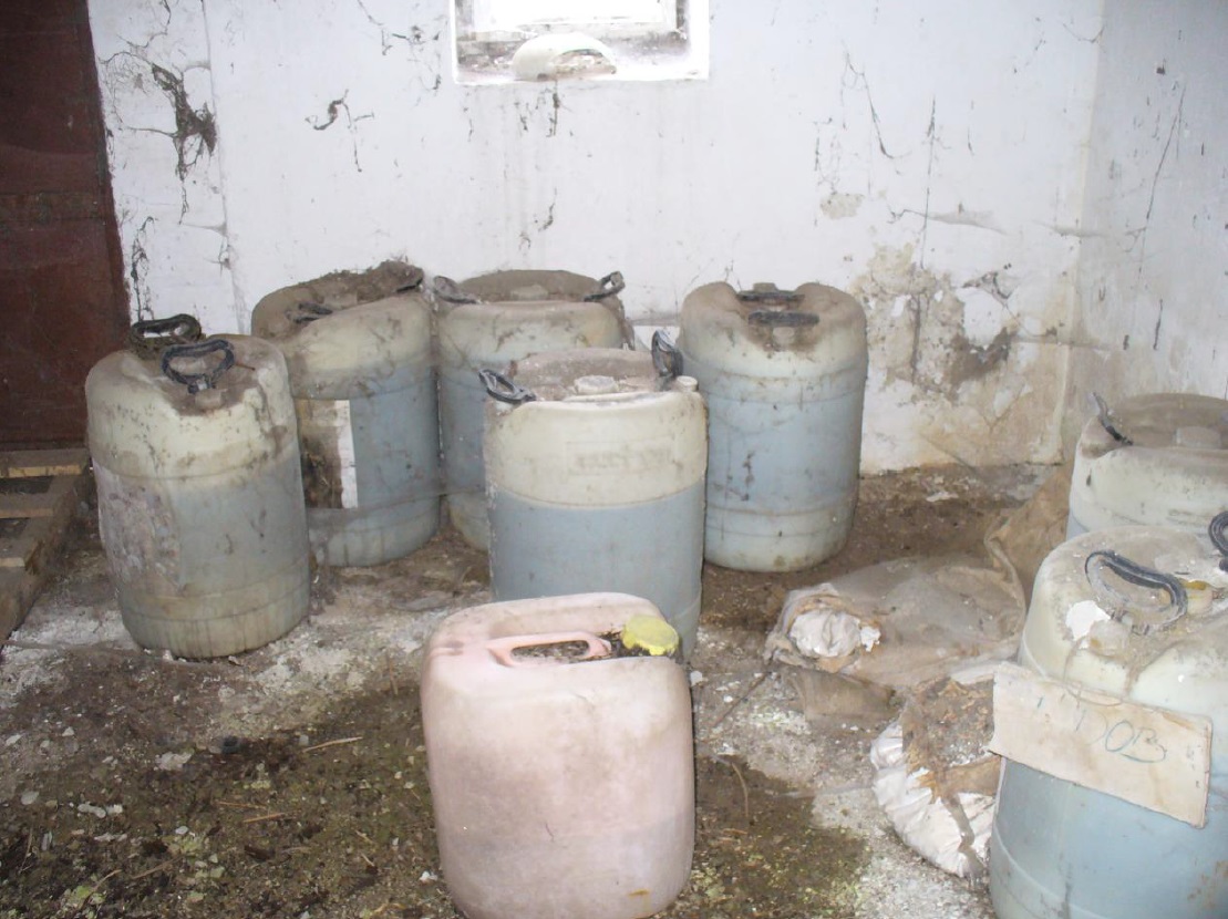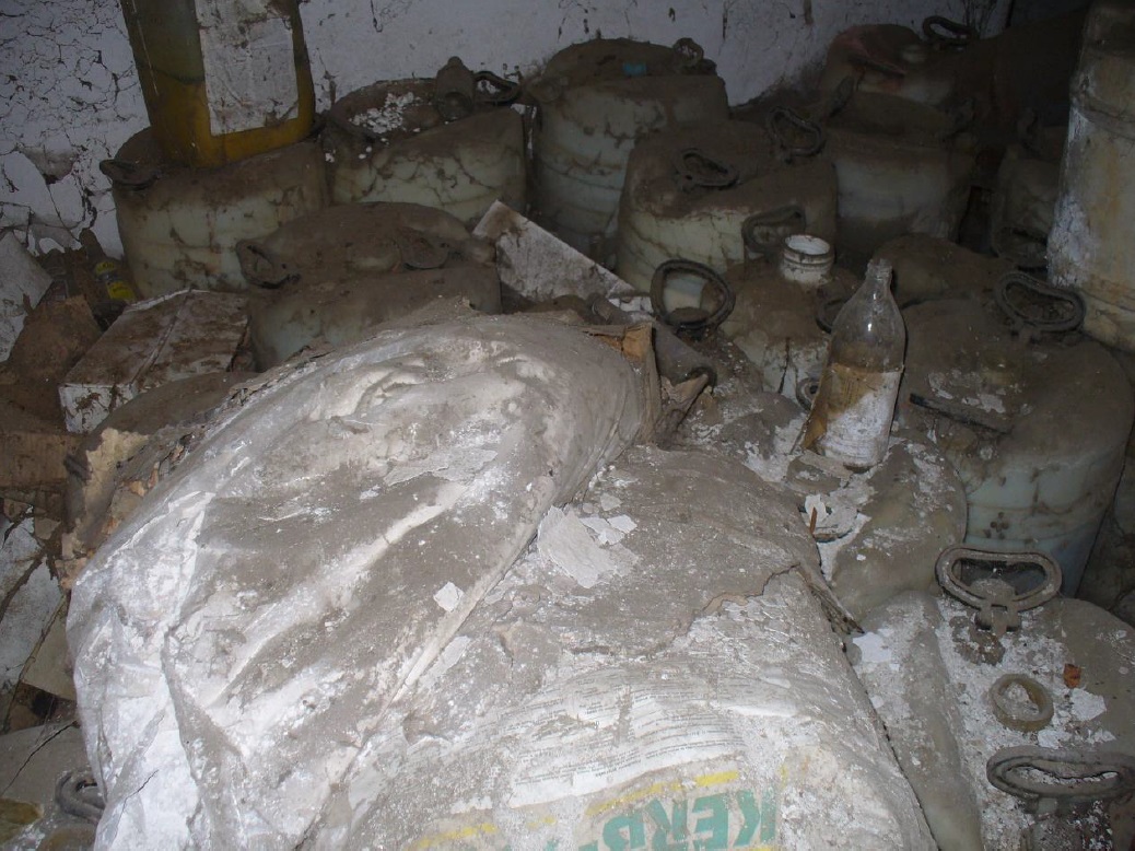 Sklad o rozmeroch cca 11 x 5 m má 3 miestnosti, jednu väčšiu a dve malé. Miestnosť väčšia, stredná, sú v nej vstupné dvere predné aj zadné a 2 zasklené malé okná. Chemikálie sa nachádzajú v strednej miestnosti po celej ploche, prevažne plastové obaly a sudy. V malej miestnosti napravo sú len práškové pesticídy uložené v papierových obaloch na dvoch paletách na kope. Malá miestnosť vľavo je prázdna, iba podlaha pokrytá suťou a zvyškami obalov. Celkom zistené cca 12 druhov pesticídov.