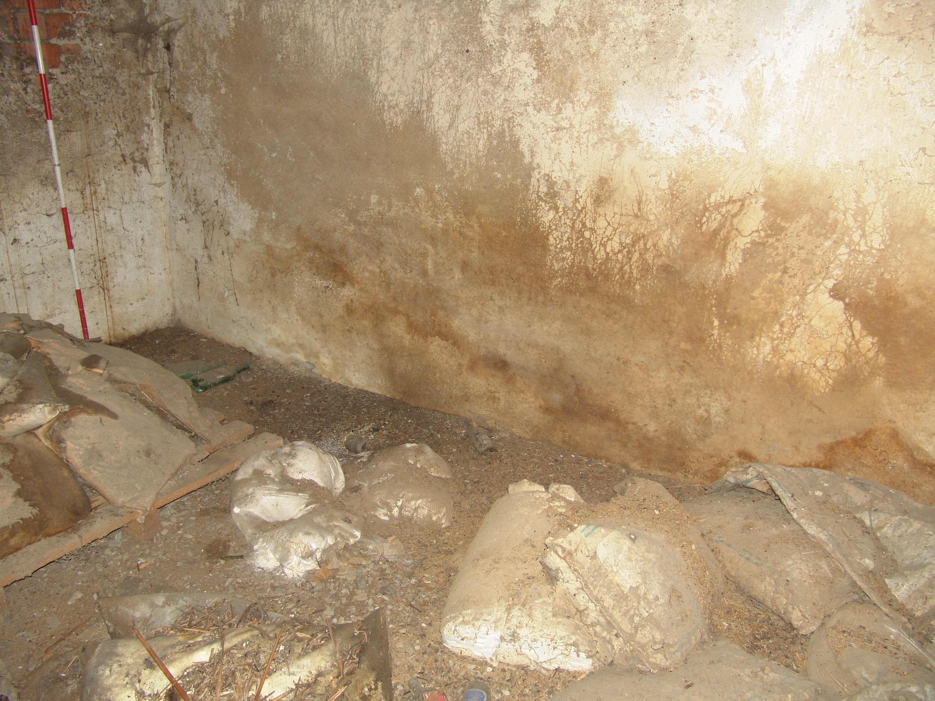 Podlaha betónová, pokrytá hrubou vrstvou starých chemikálií, zvyškami obalov a stavebnej sute. Steny omietnuté, murivo stien viditeľne kontaminované zvnútra aj zvonku, záteky do muriva. Okná sú sklenené nerozbité a uzavreté, v malej miestnosti je okno zamurované na malý vetrací otvor. Zápach po chemikáliách iba vnútri v miestnostiach.