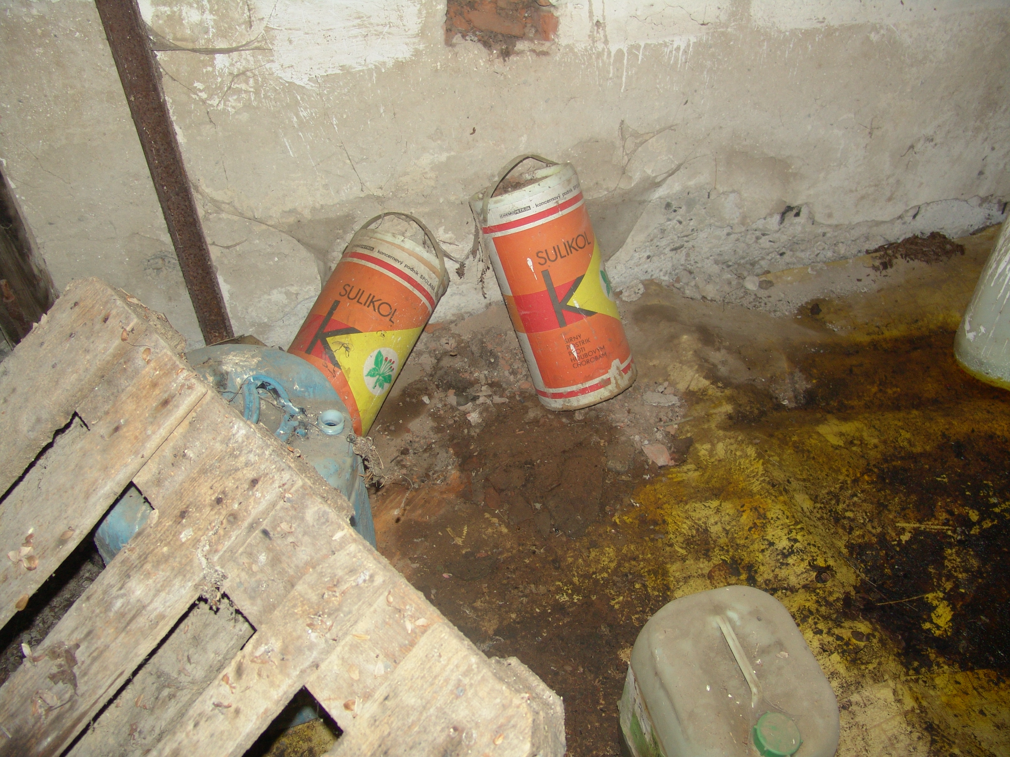 Stav objektov nevyhovujúceho skladu (stav murív, podláh, strechy...) v ktorom sú uskladnené chemické látky.